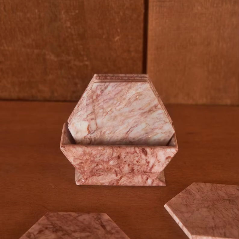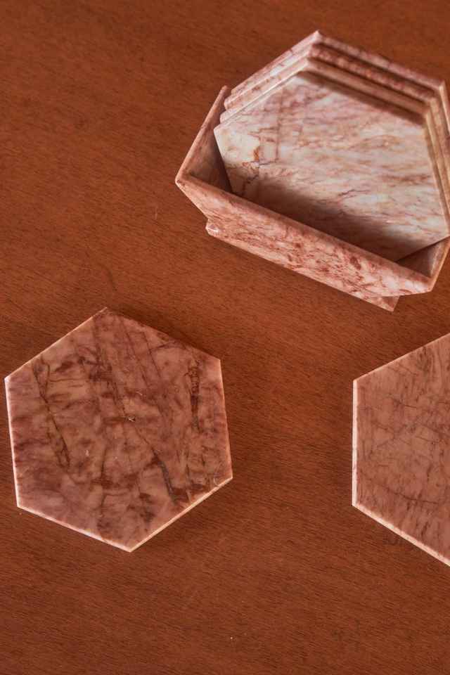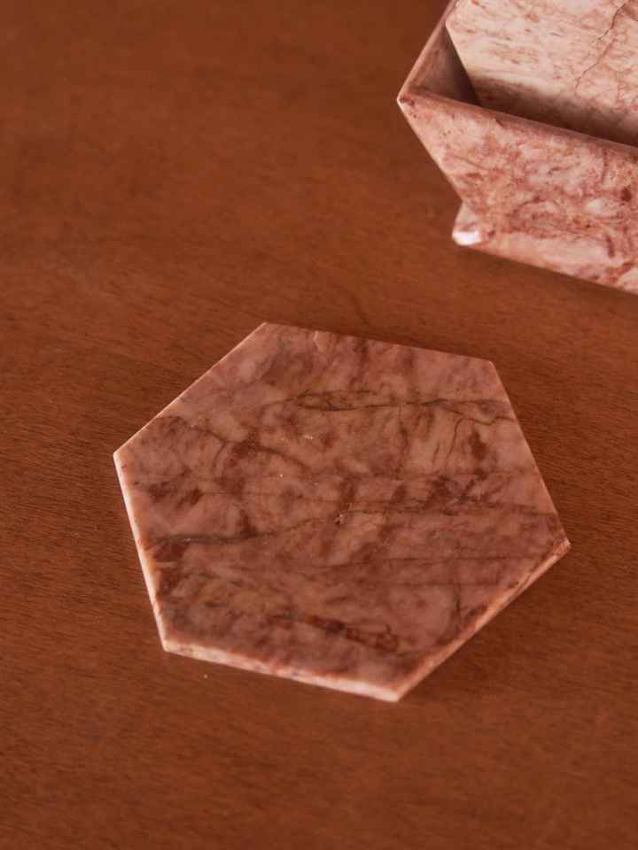 Juego de 6 posavasos hexagonales de mármol rosa, posavasos de piedra natural con soporte.