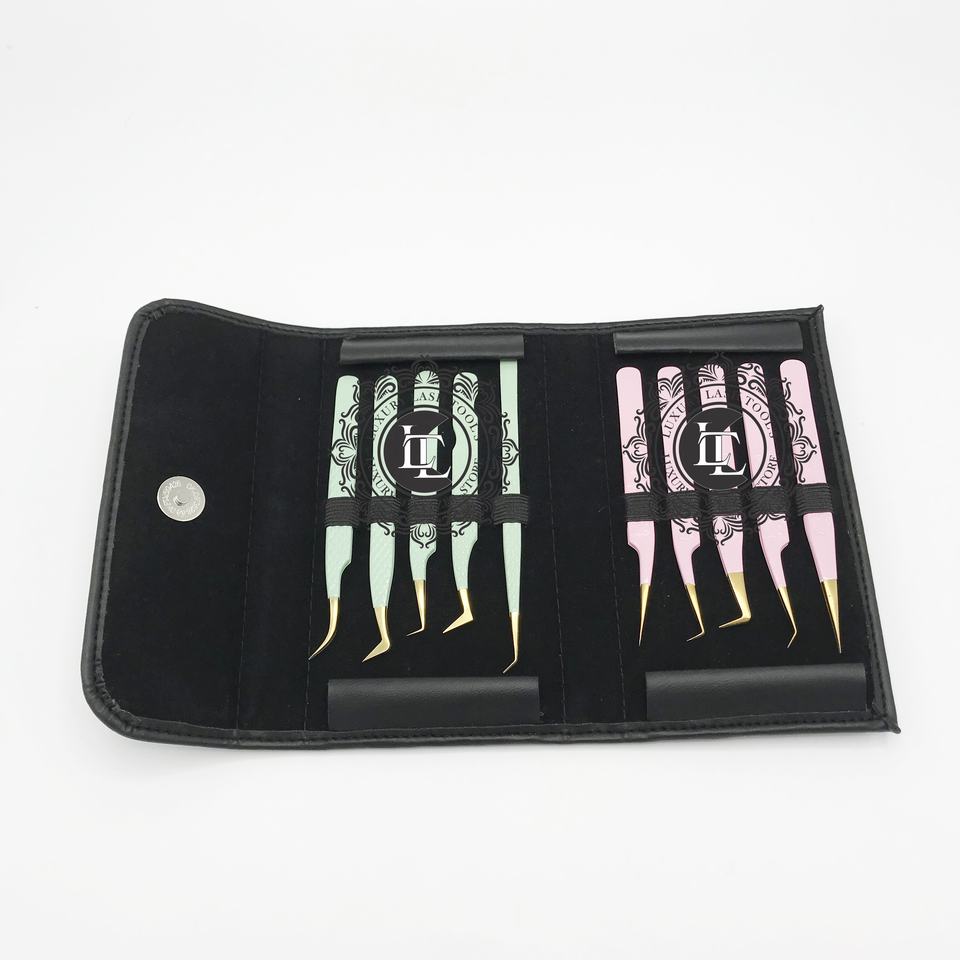 Pinzas de extensión de pestañas doradas con recubrimiento en polvo verde menta Rosa Pinzas de pestañas con punta de fibra probada a mano sostenible de acero inoxidable