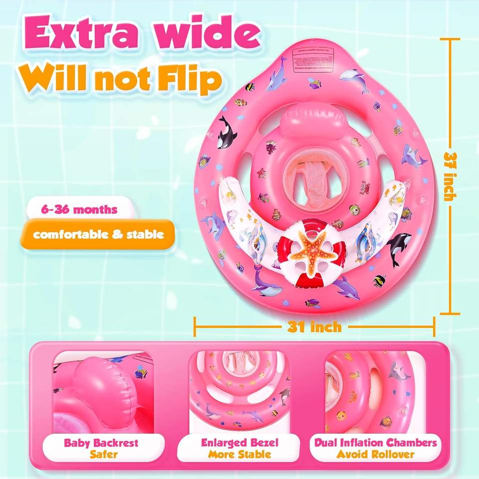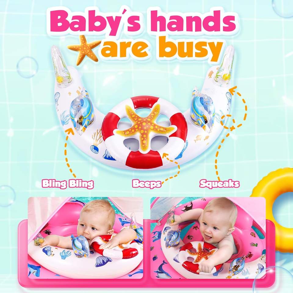 Flotador de Piscina para Bebés con Diseño Oceánico Rosa, con Toldo Solar Extraíble UPF50+ y Asiento de Seguridad Ajustable