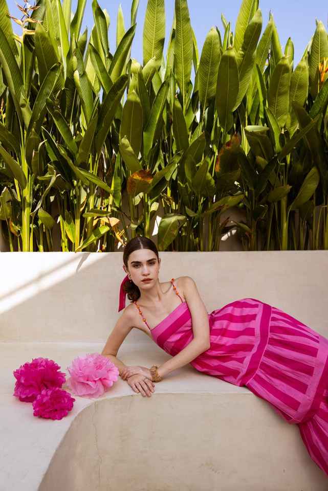 Vestido Midi de Algodón Orgánico Rosa con Estampado a Mano, Ropa Bohemia para Vacaciones para Mujer