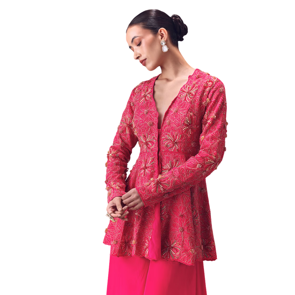 Peplum de seda cruda rosa con pantalones Palazzo circulares dobles, venta al por mayor de Ropa Étnica OEM para mujer, proveedor de fábrica, atuendo personalizado