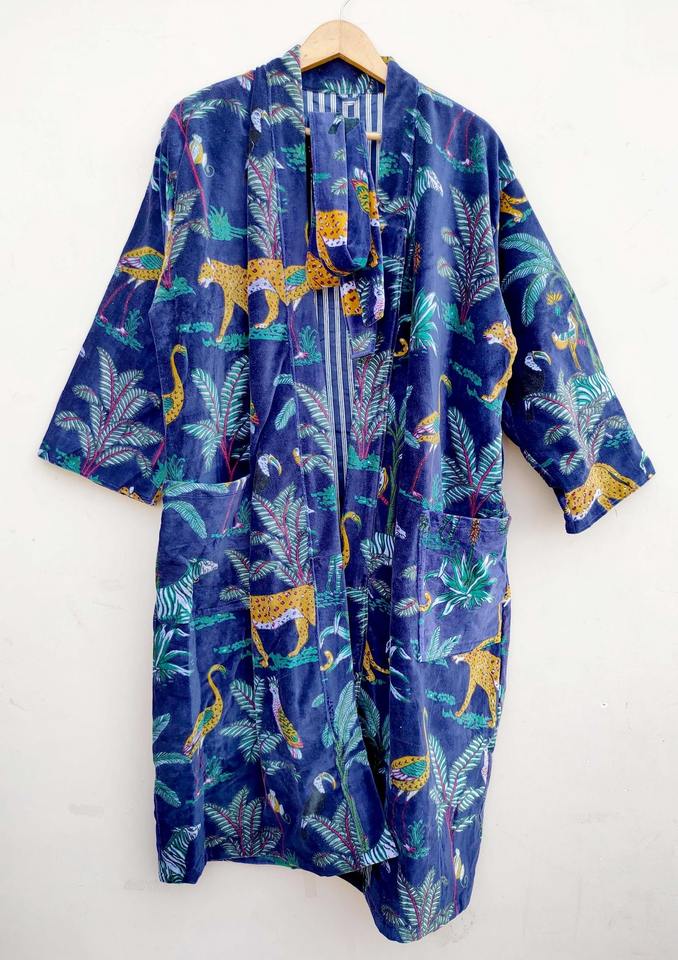 Bata Kimono de Terciopelo con Estampado Safari Rosa, Vestido Largo con Borlas Estampadas