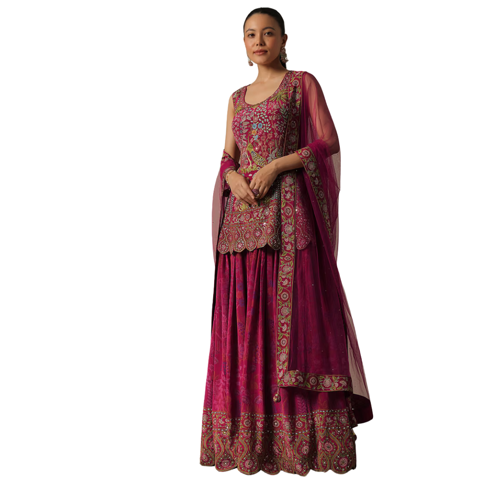 Conjunto Palazzo de seda rosa con trabajo de espejo, venta al por mayor de Ropa Étnica para mujer, proveedor de fábrica de ropa OEM, traje de fiesta de boda personalizado