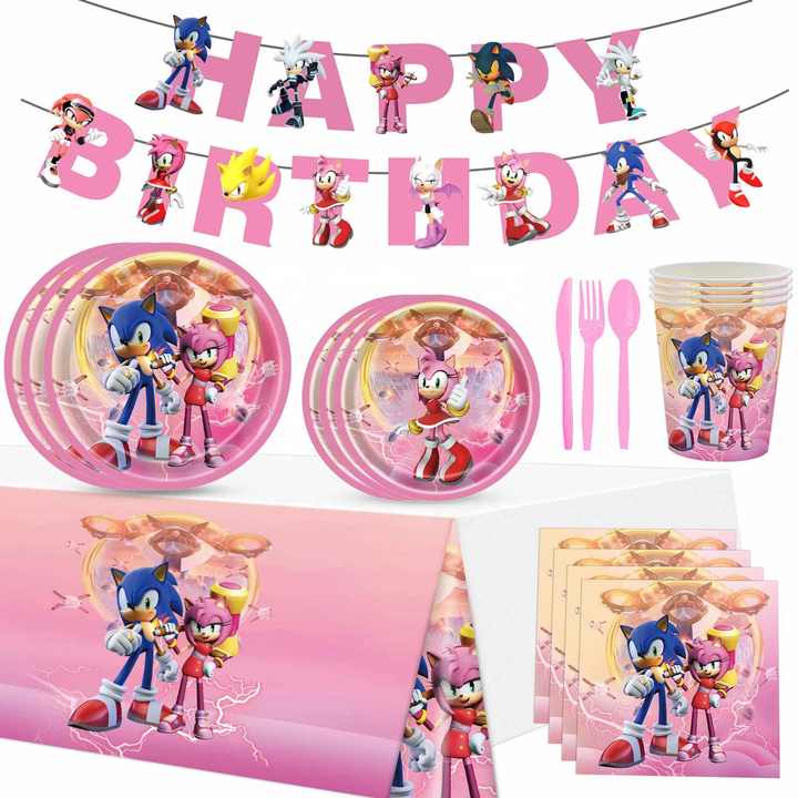 Juego de Vajilla Desechable con Diseño de Sonic Rosa para Fiestas Infantiles, Celebraciones de Cumpleaños, Eventos Divertidos