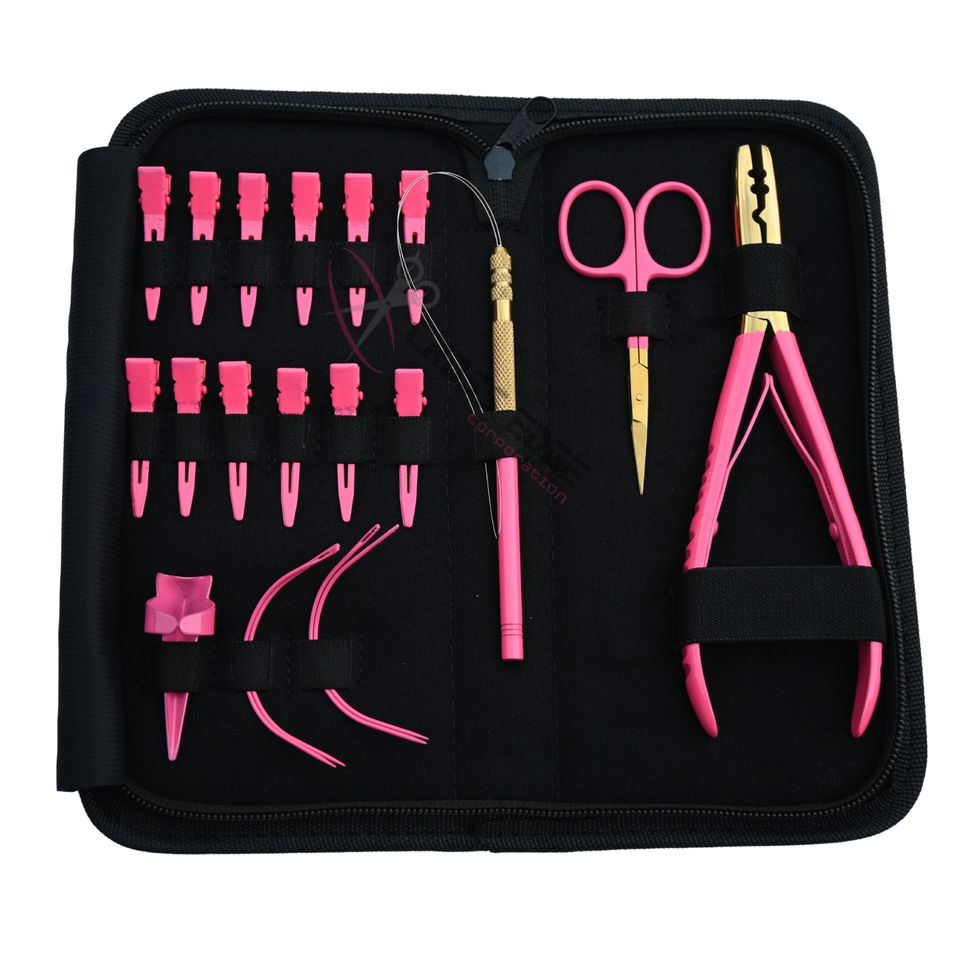 1 estuche de herramientas para extensiones de cabello, set de accesorios rosa y pinzas de pico de pato