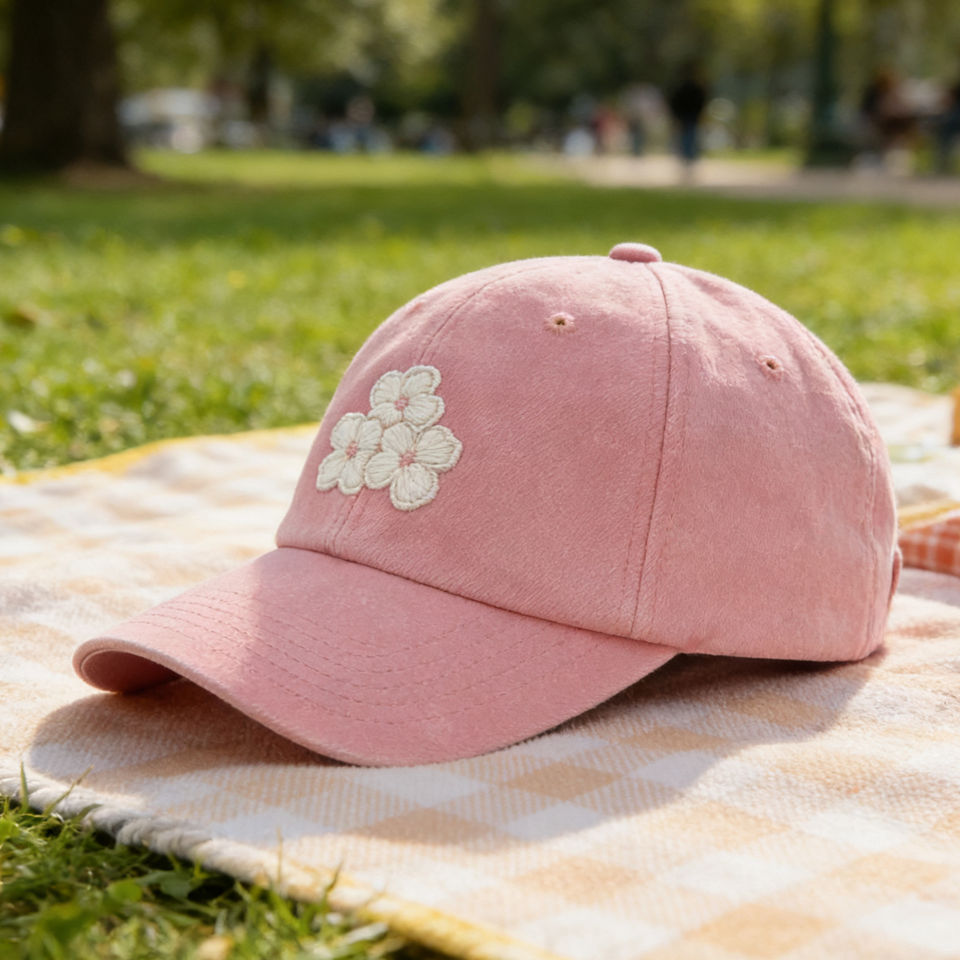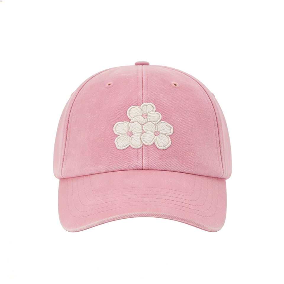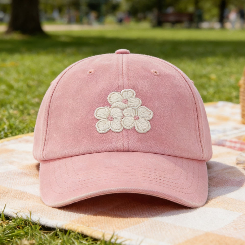 Gorra de Béisbol de Mezclilla Lavada Rosa con Tres Bordados Florales Blancos – Gorra Casual Transpirable para Golf y Senderismo