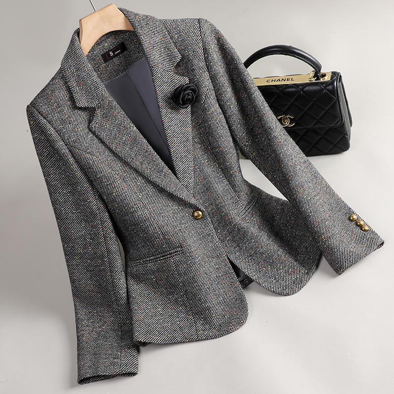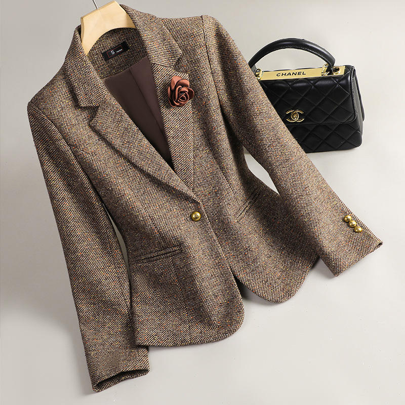 Pink Wool Blazer Women Houndstooth Pattern Single Button Casual Suit Jacket Spring Autumn Wear
