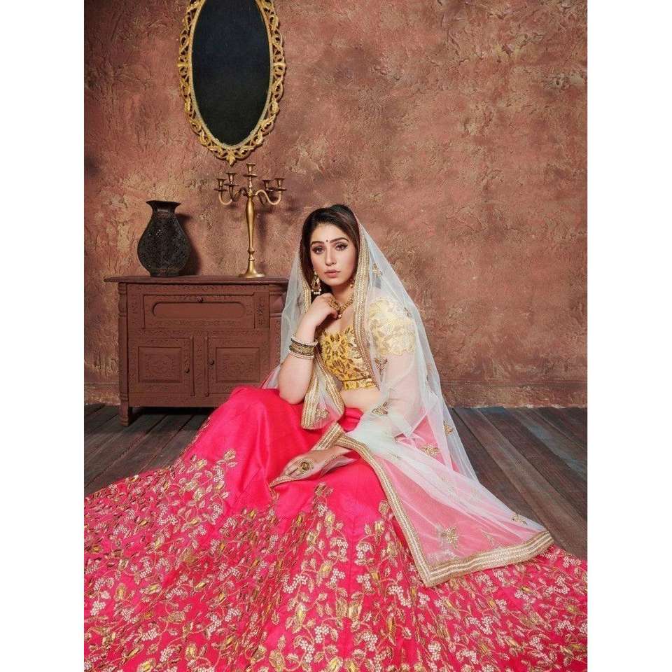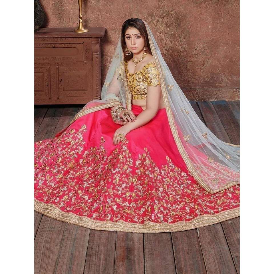 Ropa de boda de seda bordada con hilo rosa-amarillo Lehenga Choli con bordado intrincado