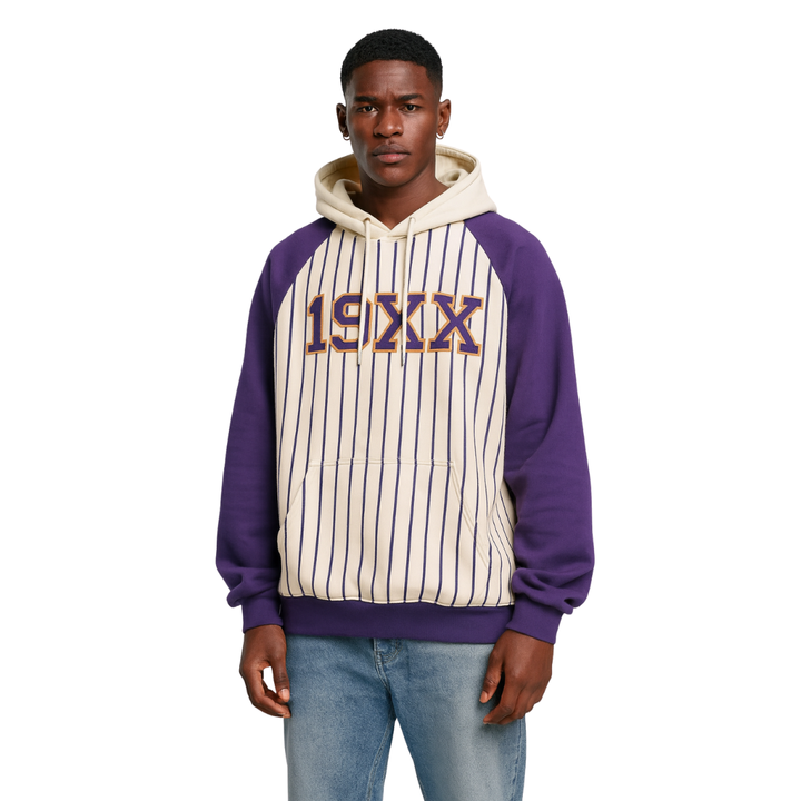 Pinstripes Design Omega Fraternity Hoodie Neutral con mangas raglán púrpura Chenille Logo Divine Nine Año de Fundación 19XX