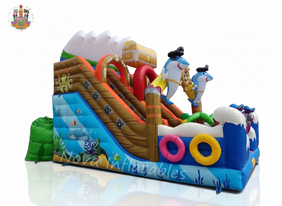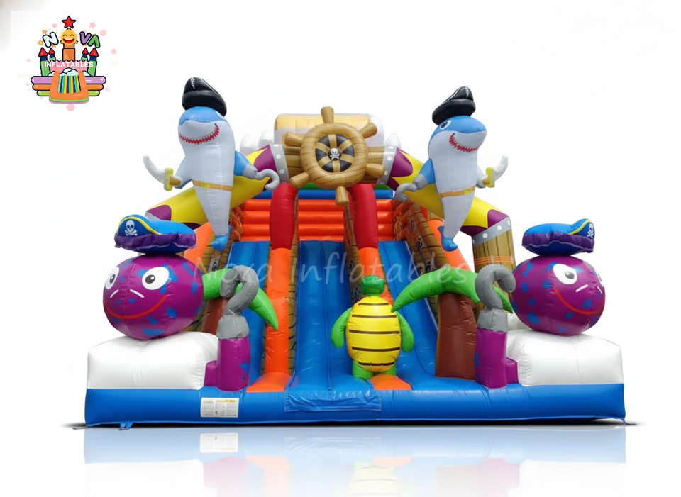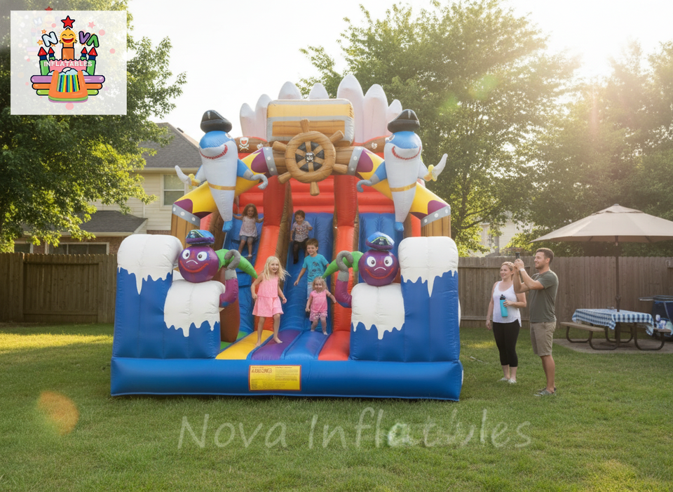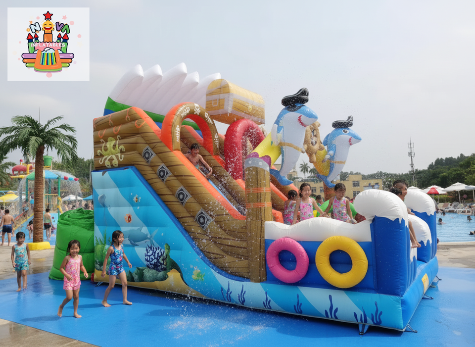 Tobogán Acuático Inflable con Diseño de Piratas y Criaturas Marinas, Equipo de Juego Acuático para Niños Inspirado en Aventuras al Aire Libre con Diseño Multicarril