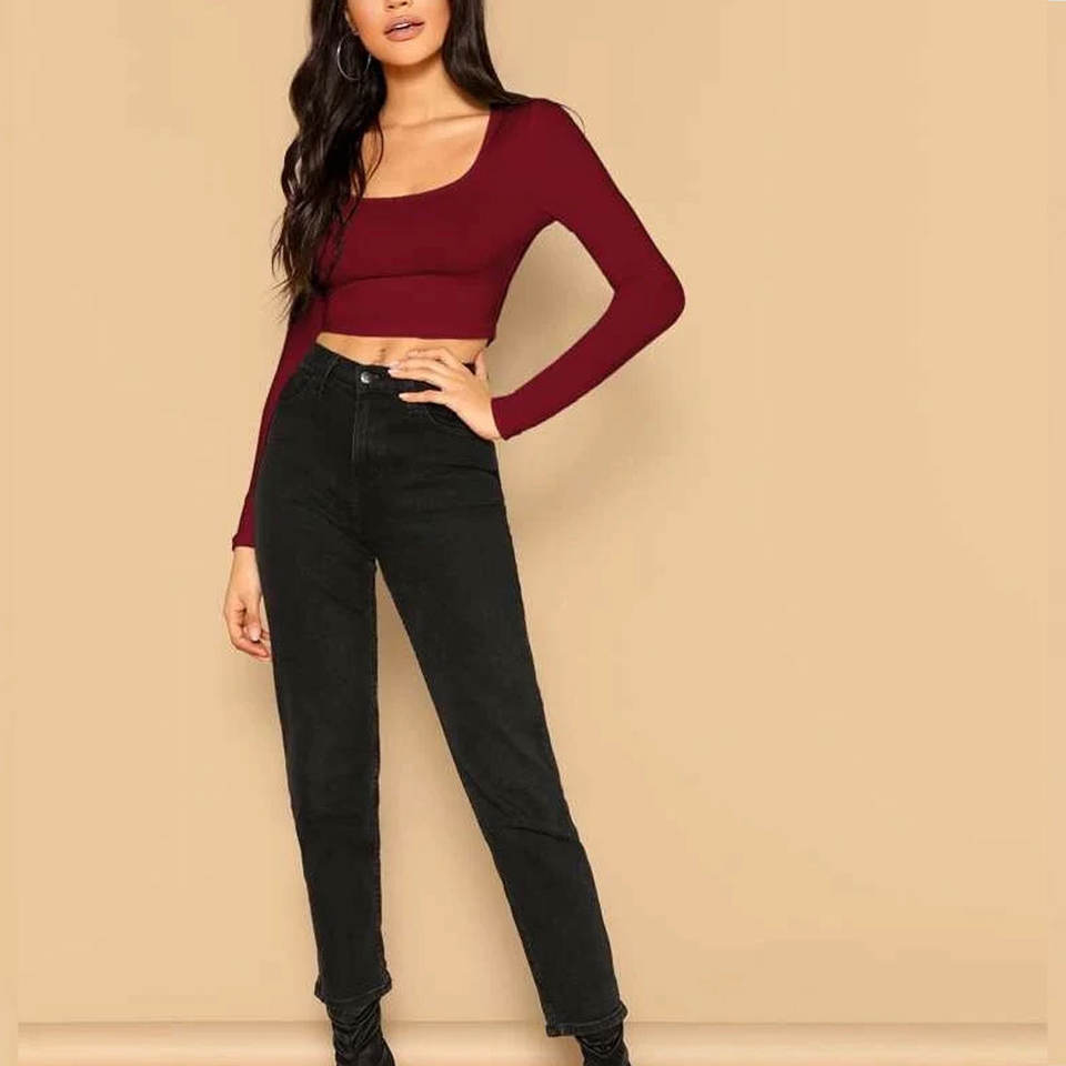 Top corto de manga larga para mujer, color negro liso con incrustaciones de diamantes de imitación, fácil de usar, ligero.