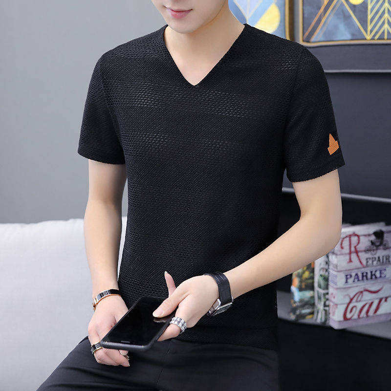 Camiseta Lisa Hombre Top de verano Ropa de calle vintage Camiseta negra de punto Cuello en V Camiseta de manga corta Casual Tallas grandes-GRIS, 5XL (Peso