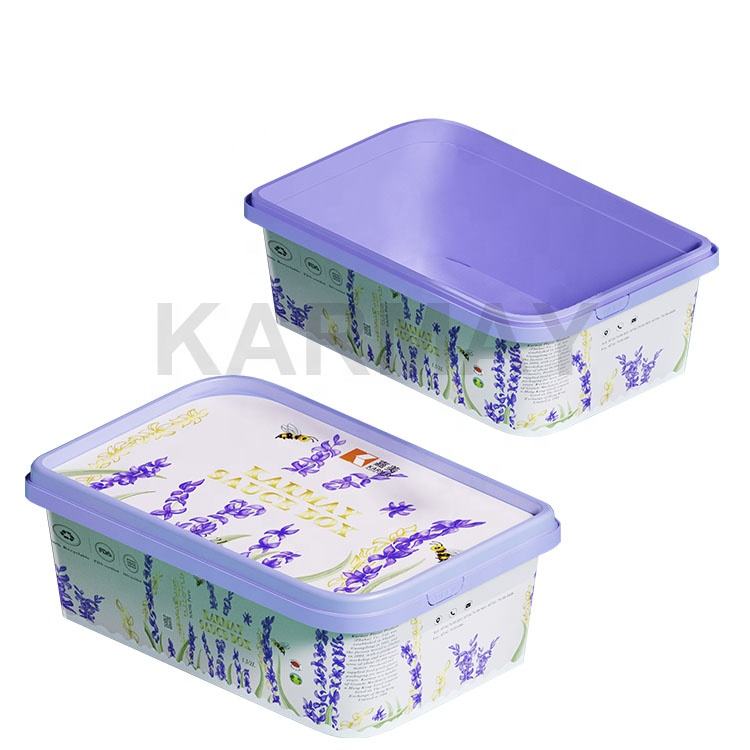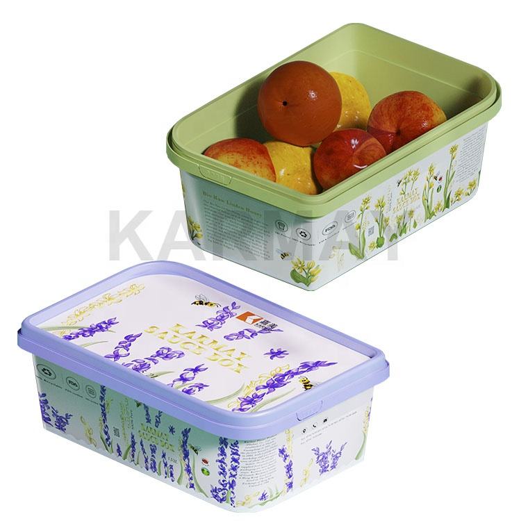 Caja de mermelada de arándanos IML cuadrada de plástico 2L, contenedor de salsa de frutas con diseño de cierre de seguridad en el soporte lateral, película de sellado