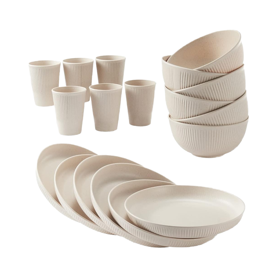 Juego de Vajilla de Plástico Irrompible y Reutilizable de 6 Piezas, Diseño Clásico, Tazas, Platos y Tazones, Apto para Lavavajillas y Microondas
