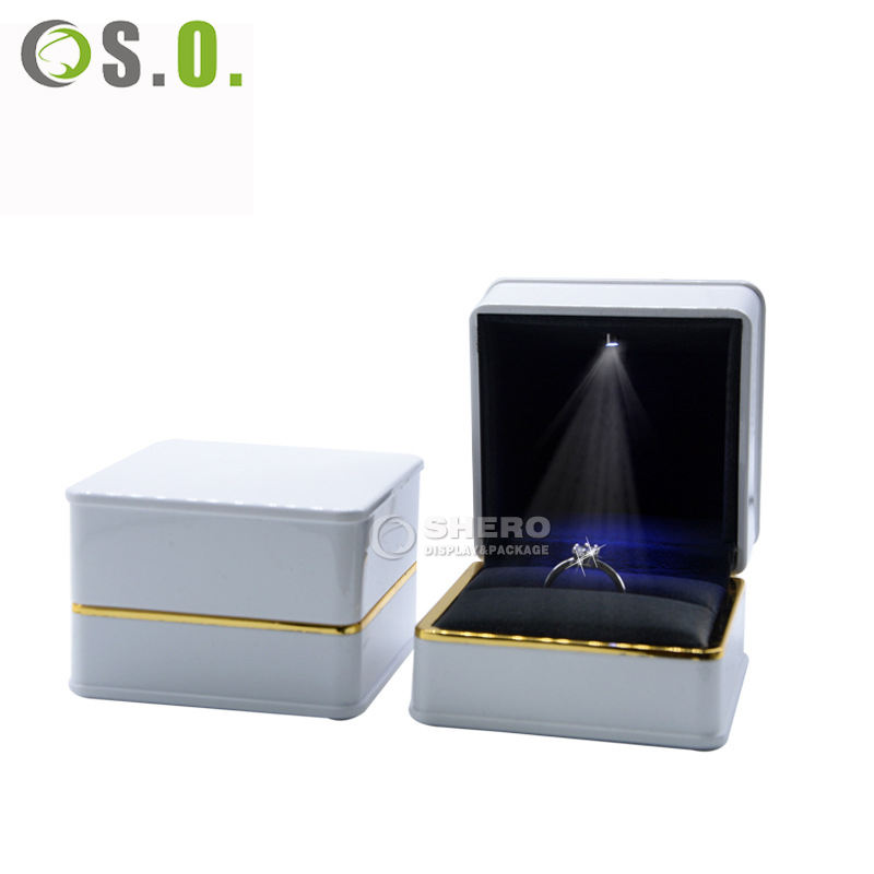 Caja de luz LED de plástico azul y roja con logotipo personalizado, caja de joyería de plástico con borde dorado