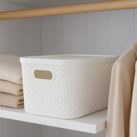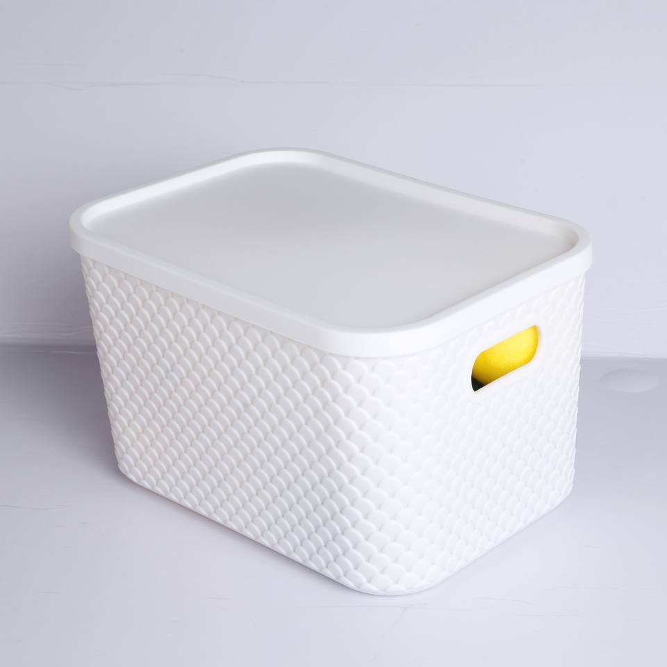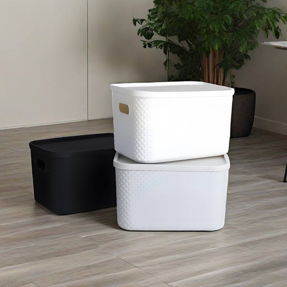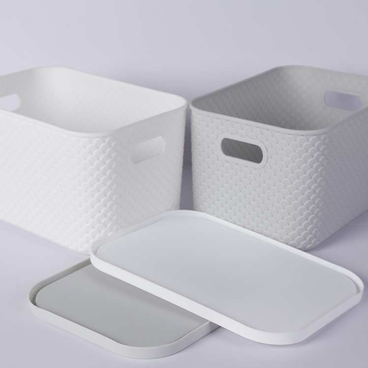 Cestas de almacenamiento de plástico con tapa Contenedores organizadores apilables para despensa Almacenamiento doméstico versátil para juguetes Ropa y más