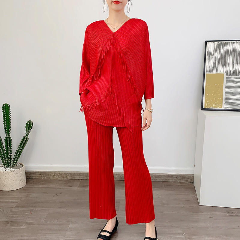 Plisado borla sólido verano cuello en V Top Casual Pantalones rectos sueltos un conjunto de las mujeres de dos piezas Co-Ord conjunto