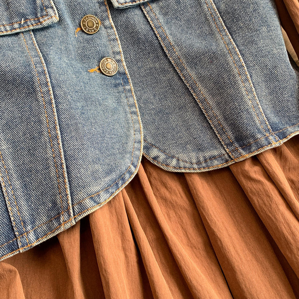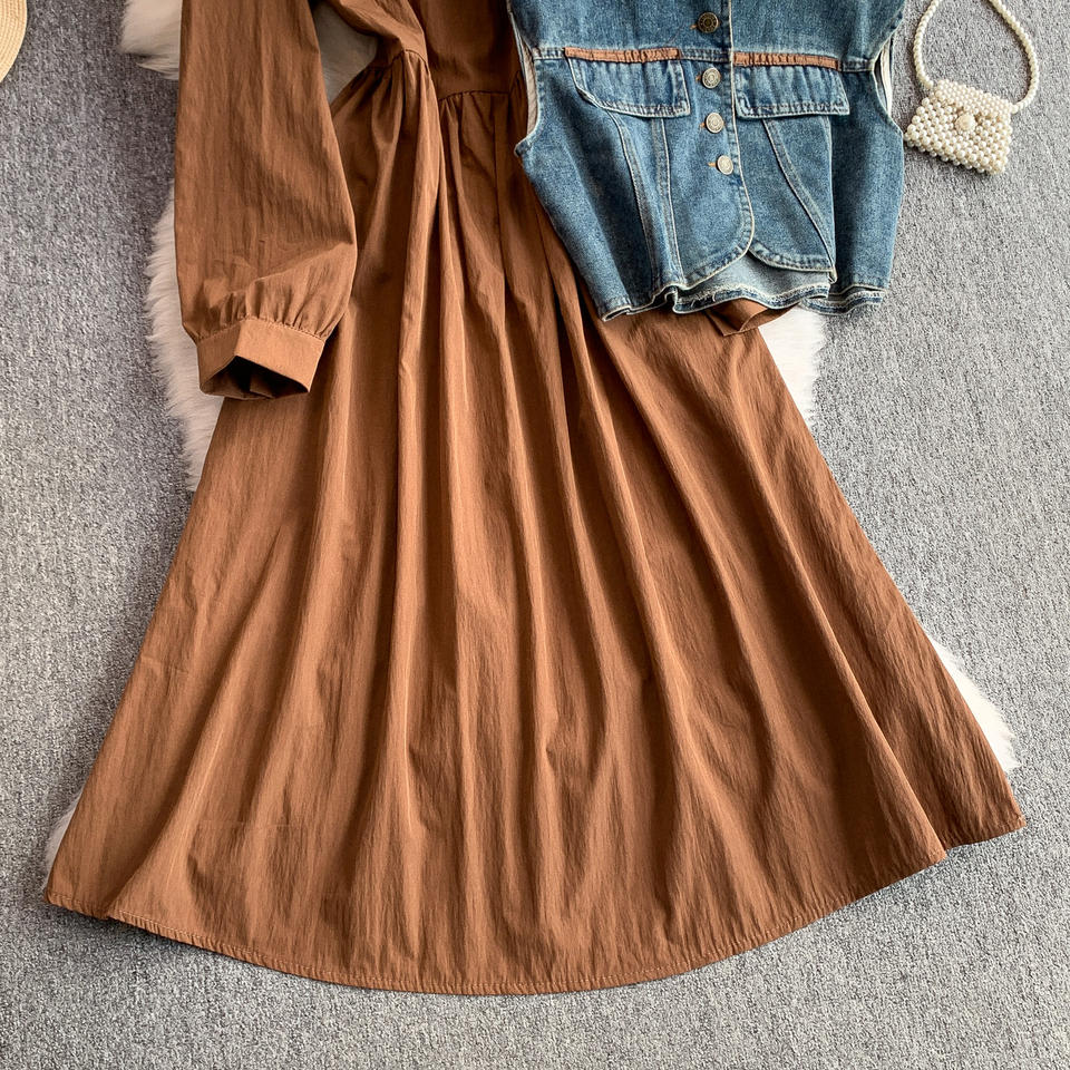 Conjunto de Vestido Tipo Camisero Marrón de Talla Grande para Mujer, Cintura Ajustable con Cordón, Cuello Redondo, Chaleco Vaquero para Combinar