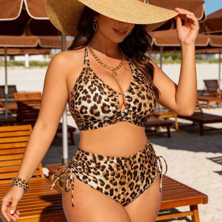 Conjunto de Bikini de Talla Grande con Estampado de Leopardo para Mujer, Top Halter con Aberturas, Braguita de Cintura Alta con Fruncido y Lazos Laterales, Traje de Baño OEM