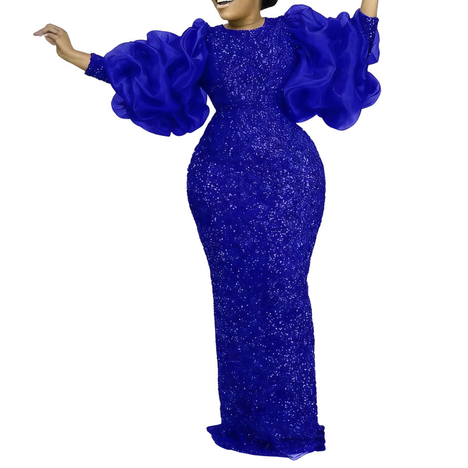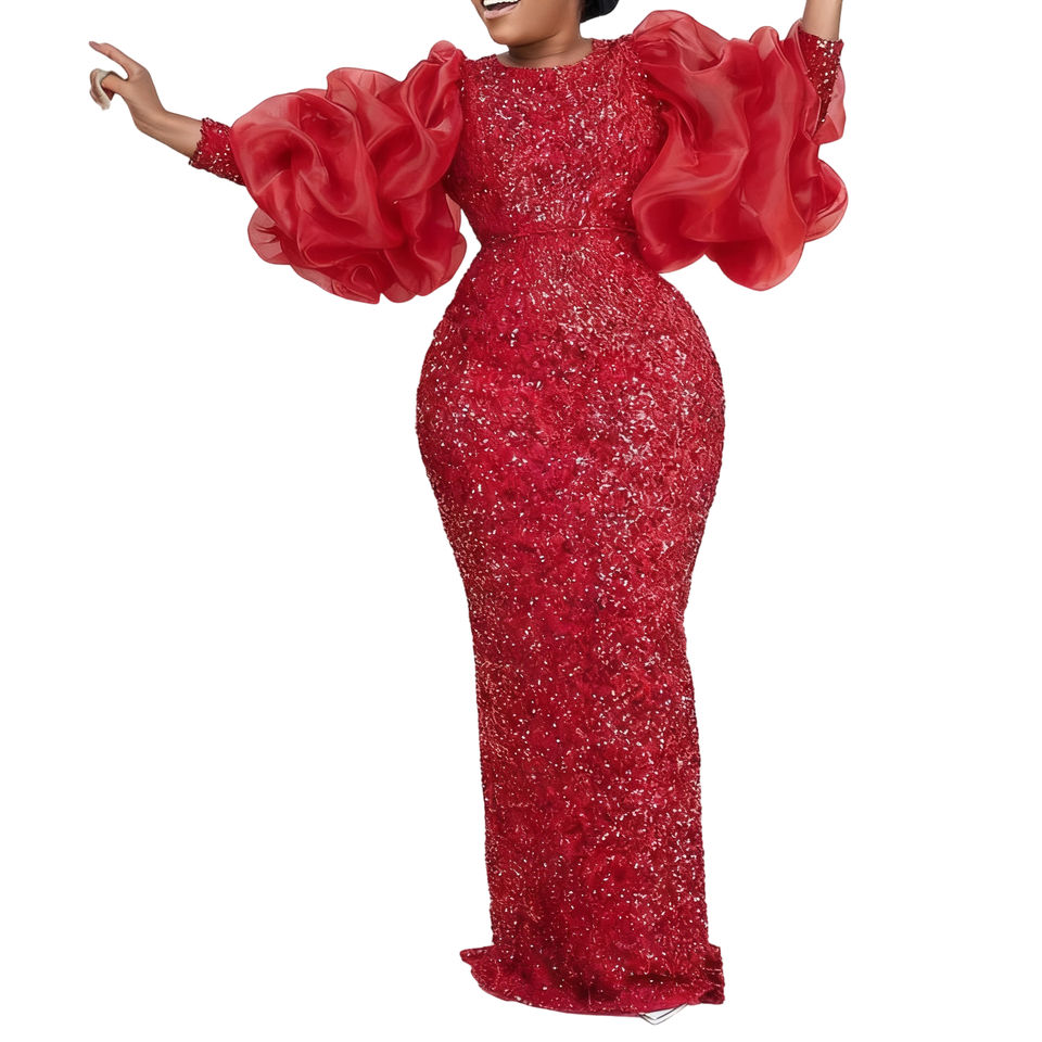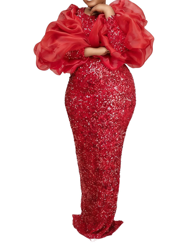 Vestidos de Noche Elegantes para Mujer, Talla Grande, con Mangas Abullonadas, Lentejuelas Bordadas y Cintura Alta, a la Moda