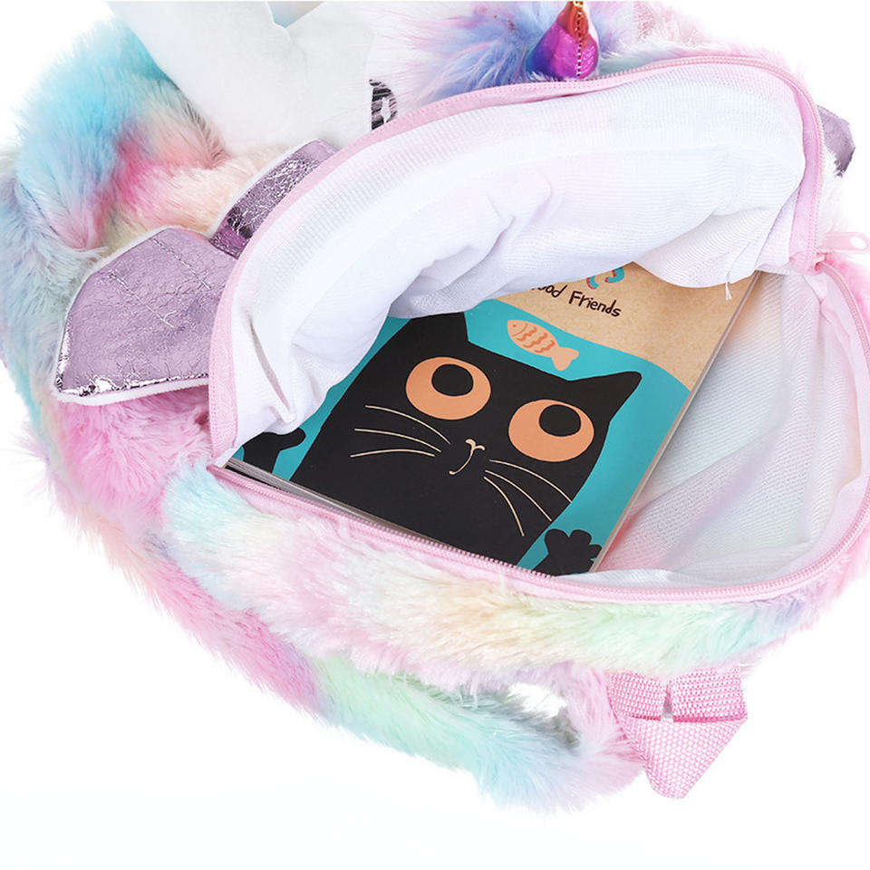 Mochila de unicornio de felpa Mochila de unicornio brillante de arcoíris de felpa suave para niños pequeños Bolso de hombro escolar para niños