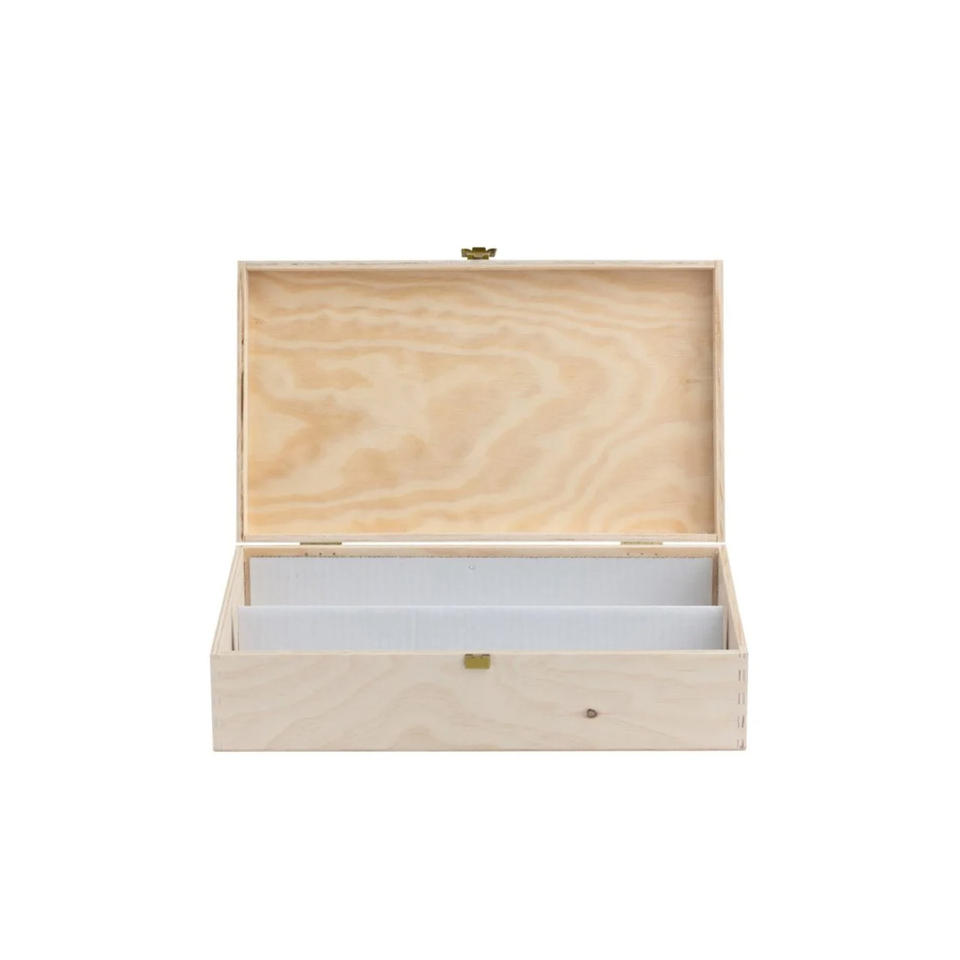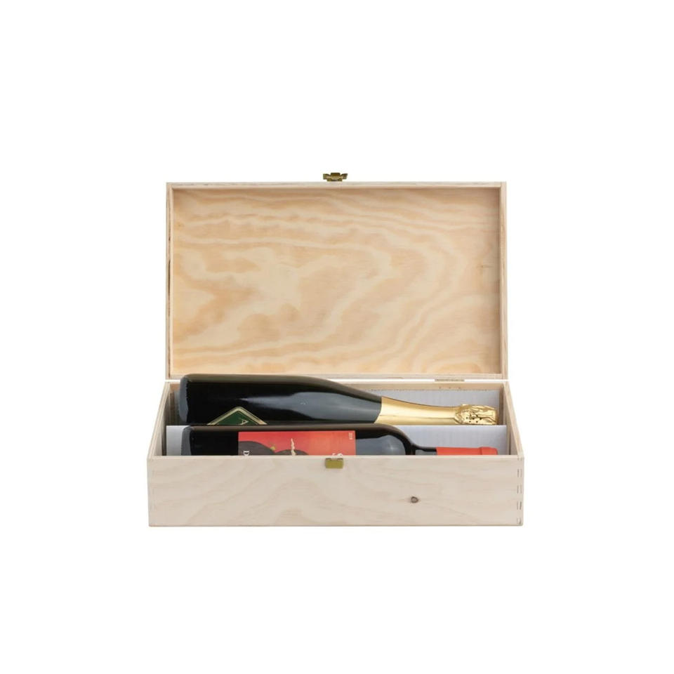 Caja de contrachapado para 2 botellas estándar, 750 ml. Dimensiones internas: 33.9X19.1X9.3