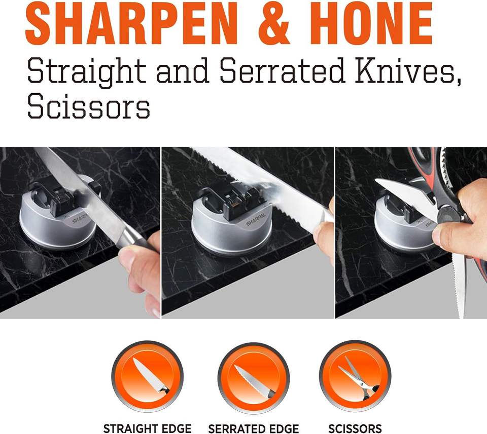 Afilador de Cuchillos y Tijeras de Cocina, Ecológico, con Piedra de Múltiples Granos para Cuchillos Lisos y Serrados, Herramienta de Afilado de 3 Etapas