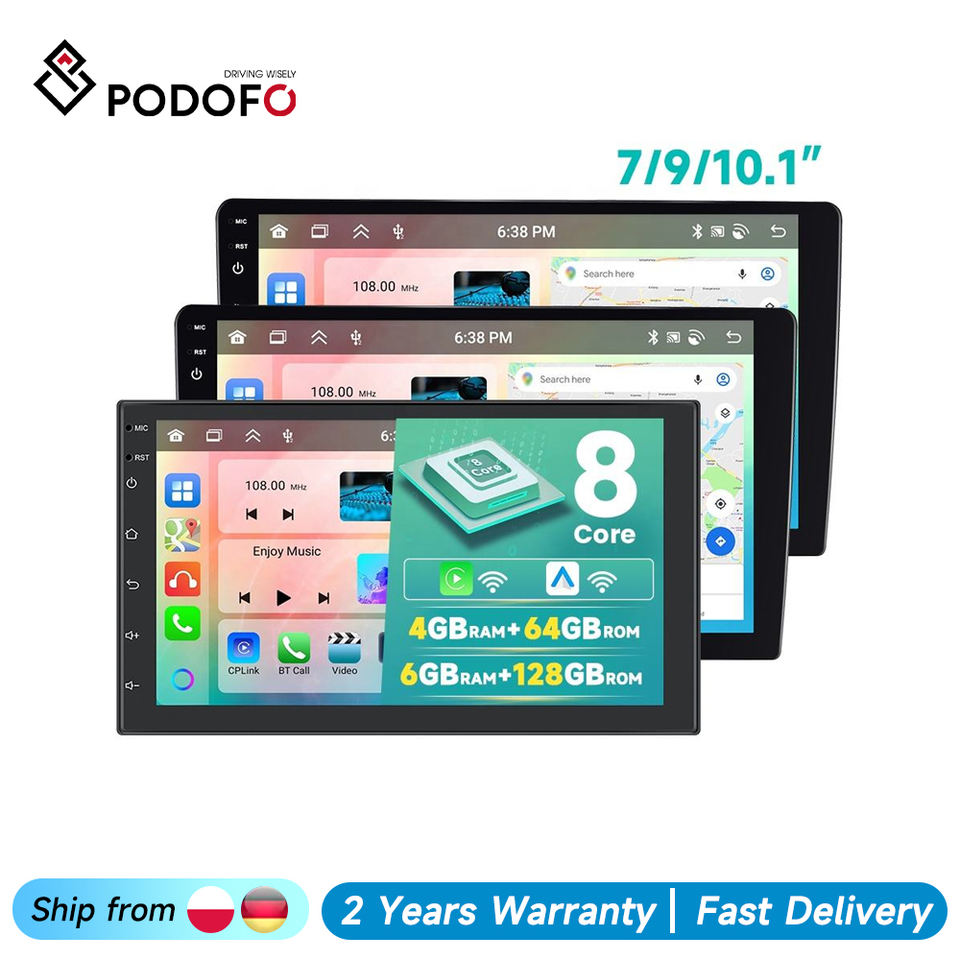 Radio para Auto Android Podofo de 7/9/10 Pulgadas, 6+128 GB, Doble DIN, Estéreo para Auto, Carplay, Android Auto, WiFi, GPS, DSP, FM, RDS, Autoradio de Fábrica