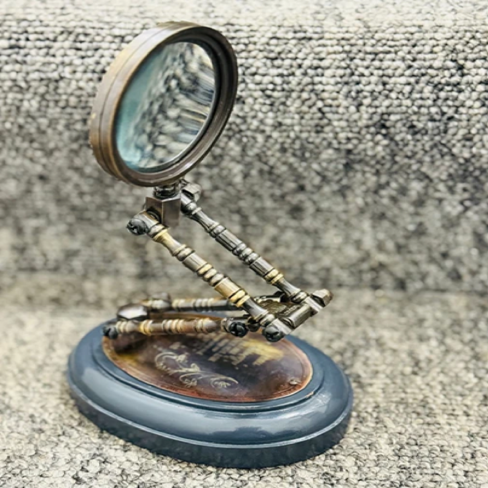 Lupa de latón pulido en un soporte resistente, altura y ángulo ajustables, accesorio de escritorio, disponible a precios de mayorista.