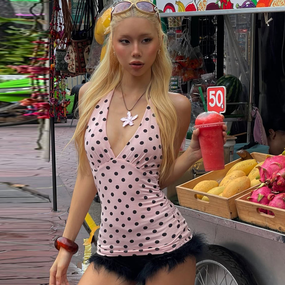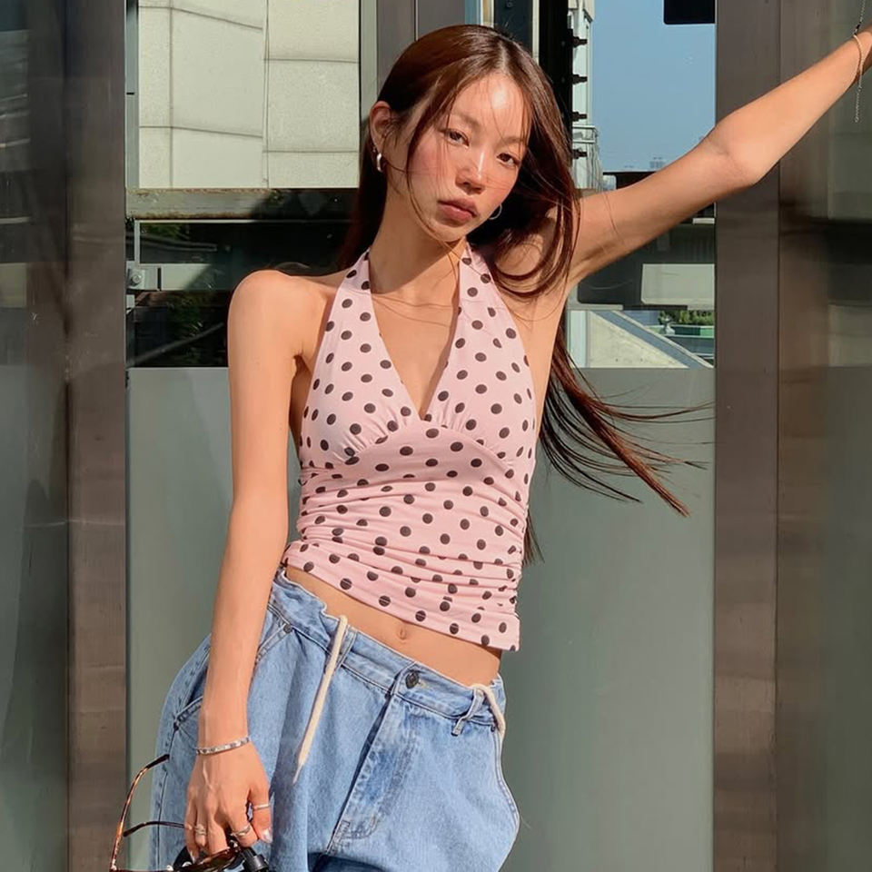 Camiseta sin Mangas con Cuello Halter y Escote en V con Estampado de Lunares para Mujer, Espalda Descubierta, Tejida, Estilo Casual, Dulce y Moderno