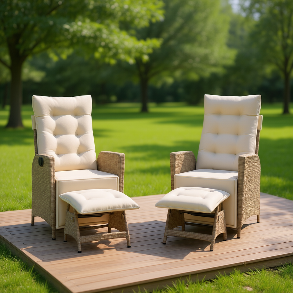 Sillas Reclinables de Ratán Sintético para Patio con Reposapiés, Beige, Muebles de Jardín para Exteriores, Estilo Moderno y Contemporáneo