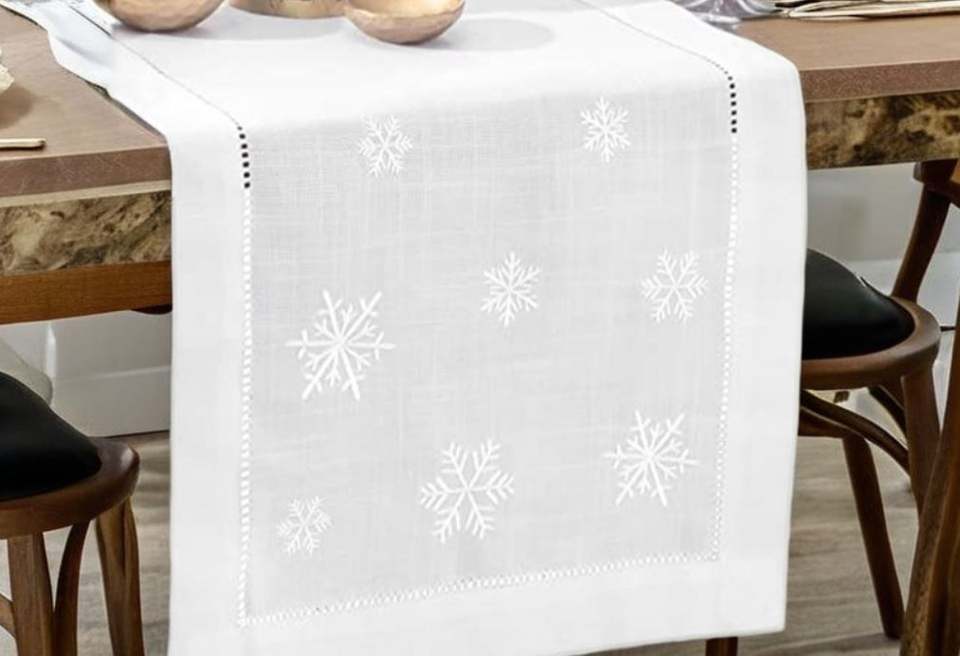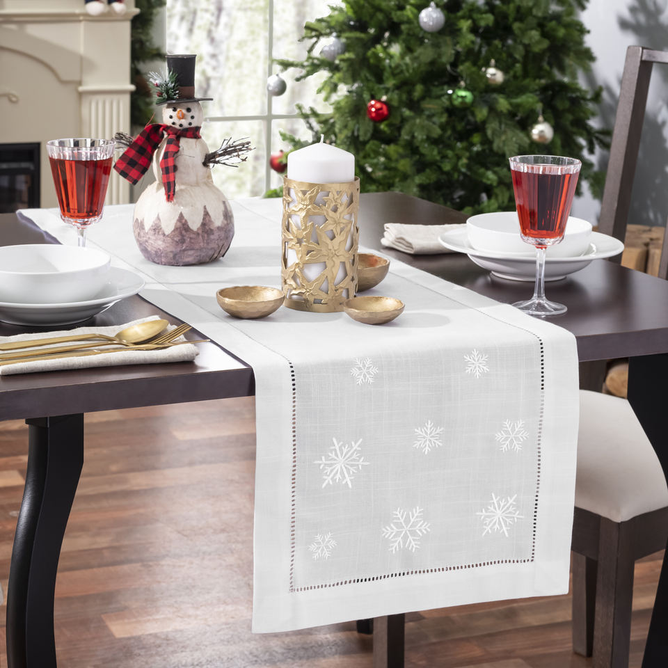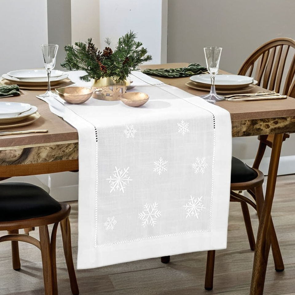 Camino de mesa bordado de copos de nieve blanco personalizado al por mayor, poliéster, lino, mezcla geométrica para el hogar, hotel, restaurante, vacaciones