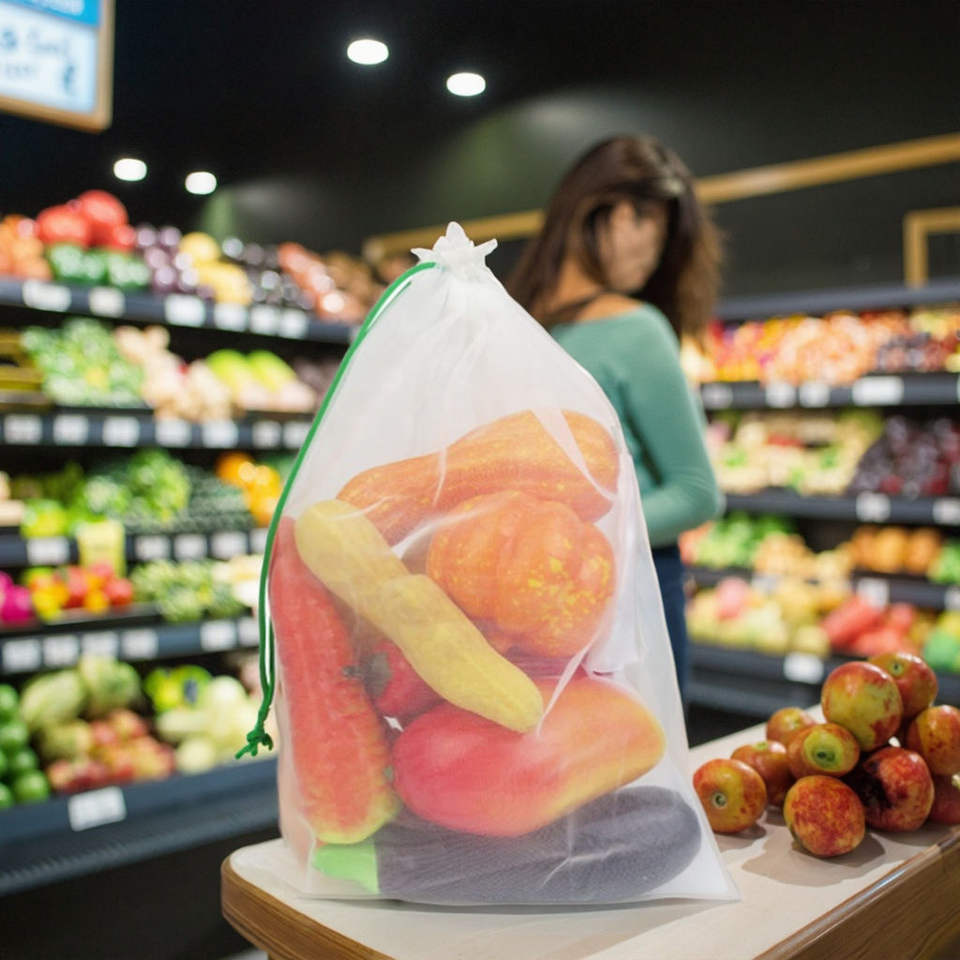 Bolsa de malla de poliéster - Ecológica y reciclable, tamaño personalizable, ligera, personalizable con logotipo, reutilizable