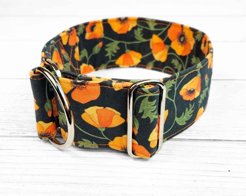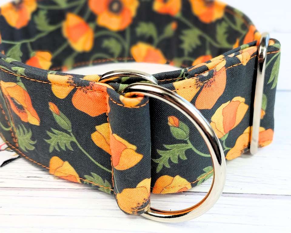 Collar de perro de tela de galgo negro Amapola, collar de Whippet con hebilla o martingala de deslizamiento limitado/amapolas naranja