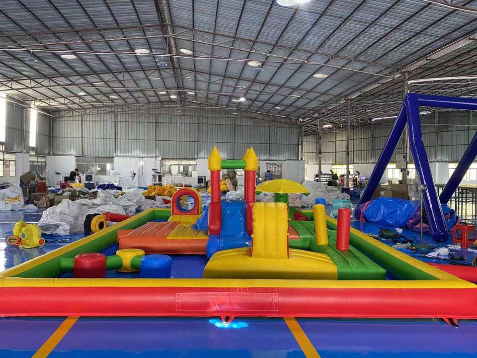 Popular Azul Rojo amarillo verde inflable hinchable para fiesta evento Ball pit play parque acuático jugar castillo hinchable Splash pad para alquilar
