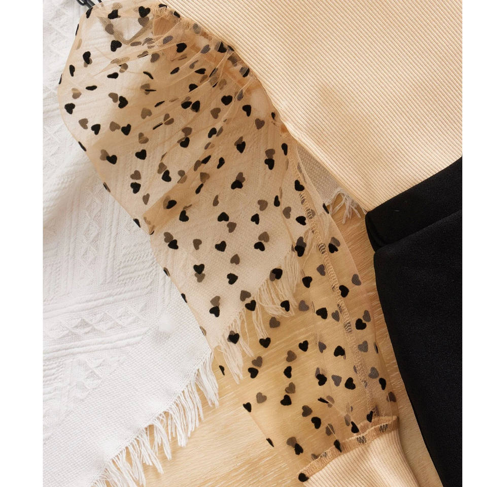 Product Name:Mesh Puff Sleeve Heart Printed Cotton Striped T-shirt Bow Front Skirt