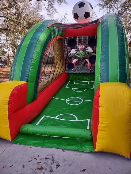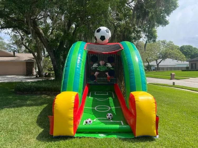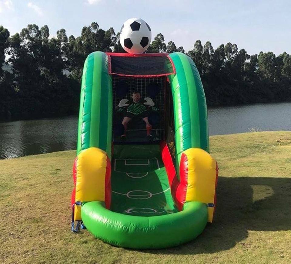 Popular gigante al aire libre inflable fútbol tiro deportes juegos volar juego de fútbol con soplador interactivo evento alquiler de juegos