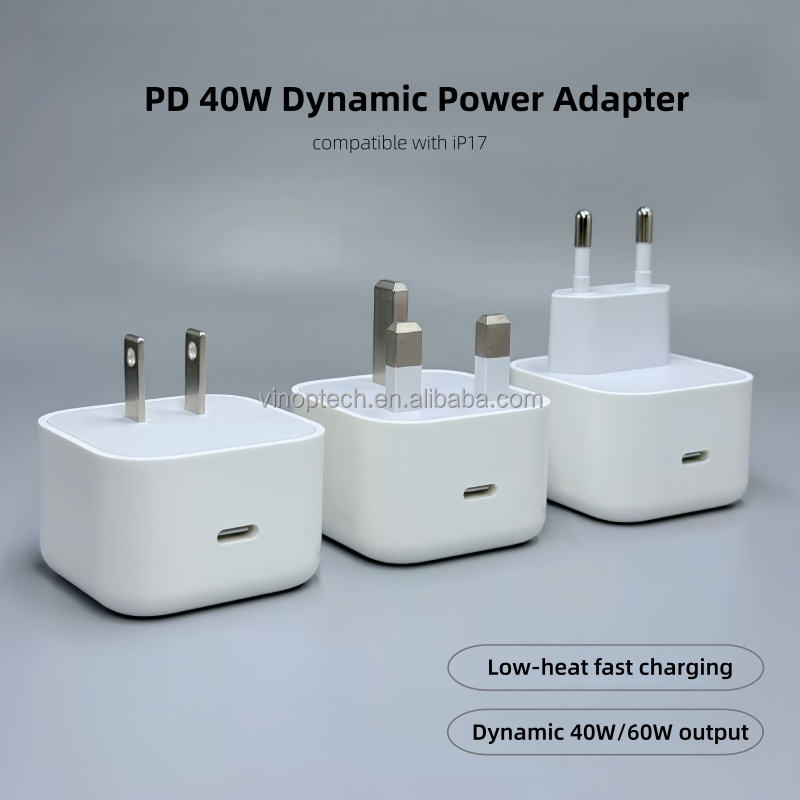 Adaptador de Corriente USB-C PD 3.0 de 40W, Resistente al Fuego, Cargador Rápido para iPhone 17 Pro Max, Laptop, Enchufes US, EU, UK