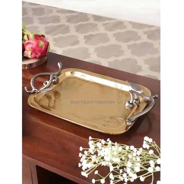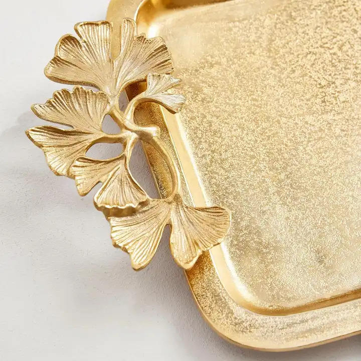 Bandeja de servicio rectangular de Metal popular con asas de hoja de Ginkgo, bandejas de mesa para servir alimentos chapadas en oro para el hogar y la boda