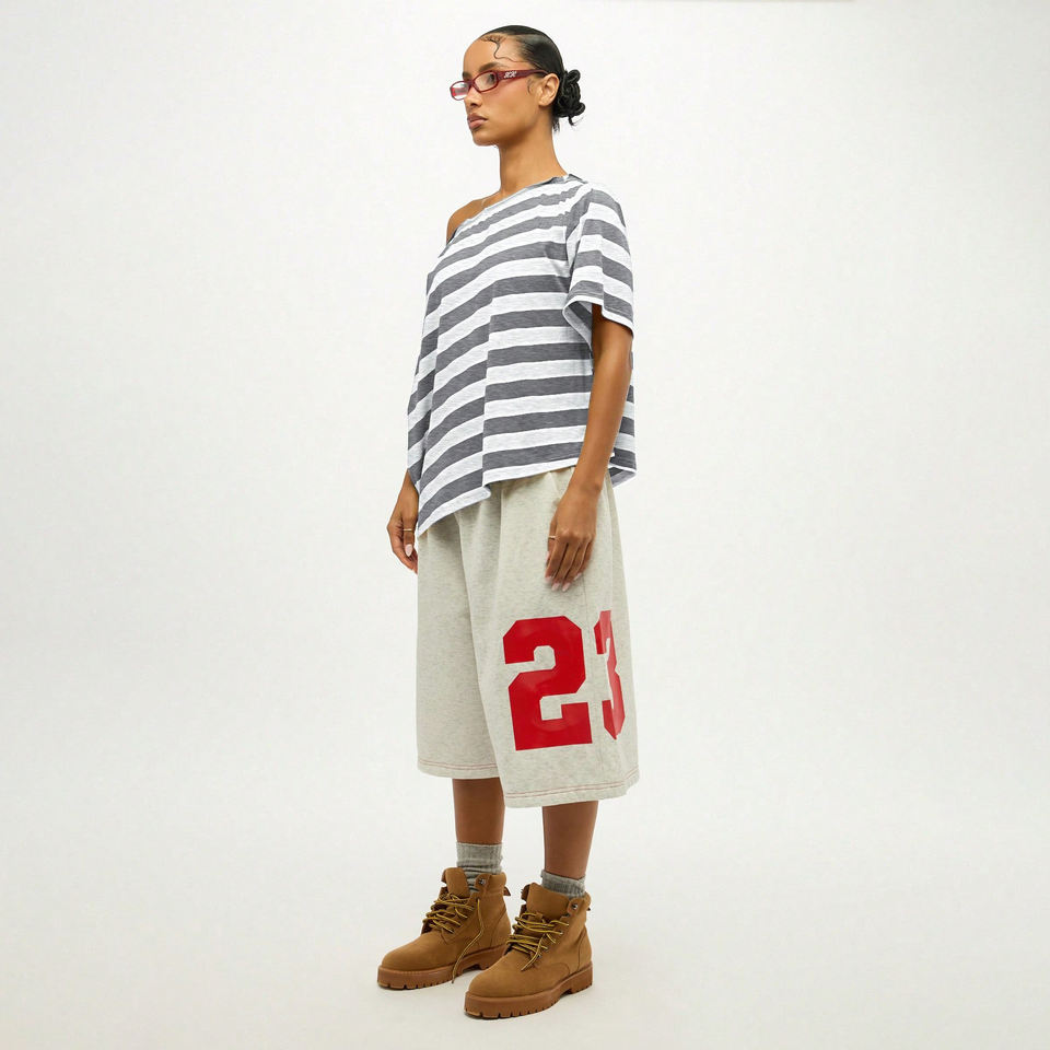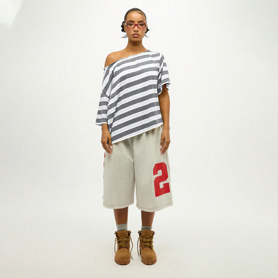 Camiseta Popular de Mujer con Hombros Descubiertos, Logotipo Estampado, Cuello Redondo, Manga Corta, Holgada, Ecológica, Transpirable, de Jersey a Rayas