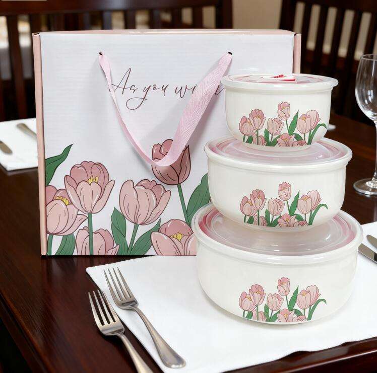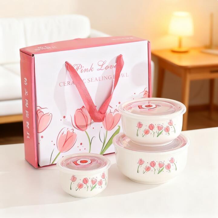 Tazón de Porcelana para Conservar Alimentos Frescos, Vajilla para Almuerzo y Cena, Apto para Microondas y Refrigerador, Tazón de Cerámica para Cocina con Tapa