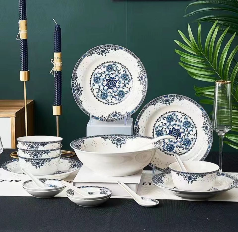 Juego de vajilla de porcelana Juego de vajilla azul y blanca de lujo de 18 cabezas Juego de 4 servilleteros de tetera italiana azul de cerámica