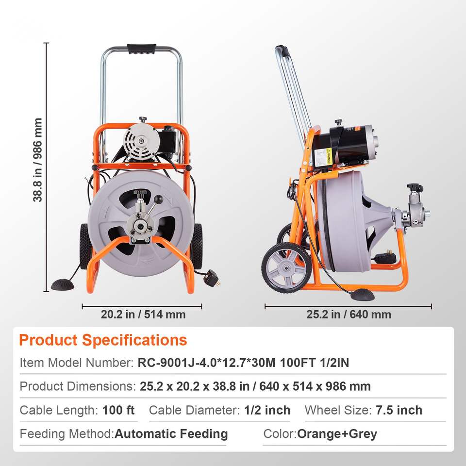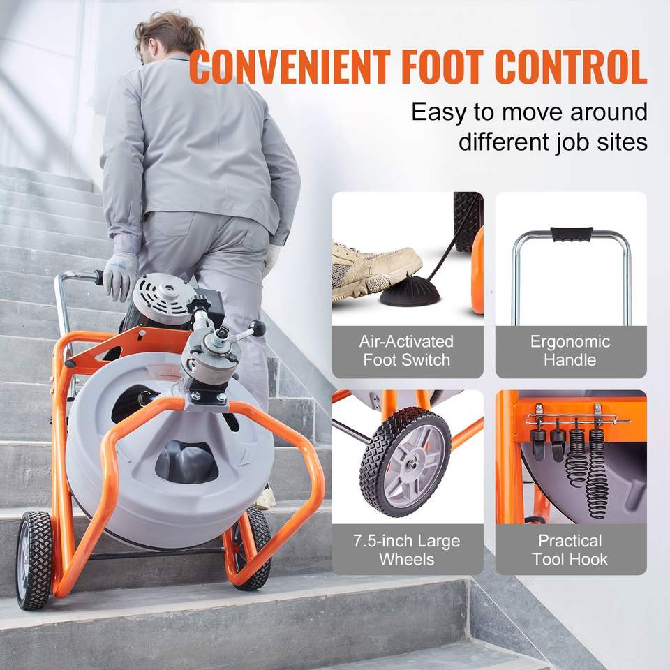 Máquina limpiadora de alta presión portátil con ruedas de 8 cuchillas para desatascar desagües y tuberías, con alimentación automática, de 100 pies x 1/2 pulgada