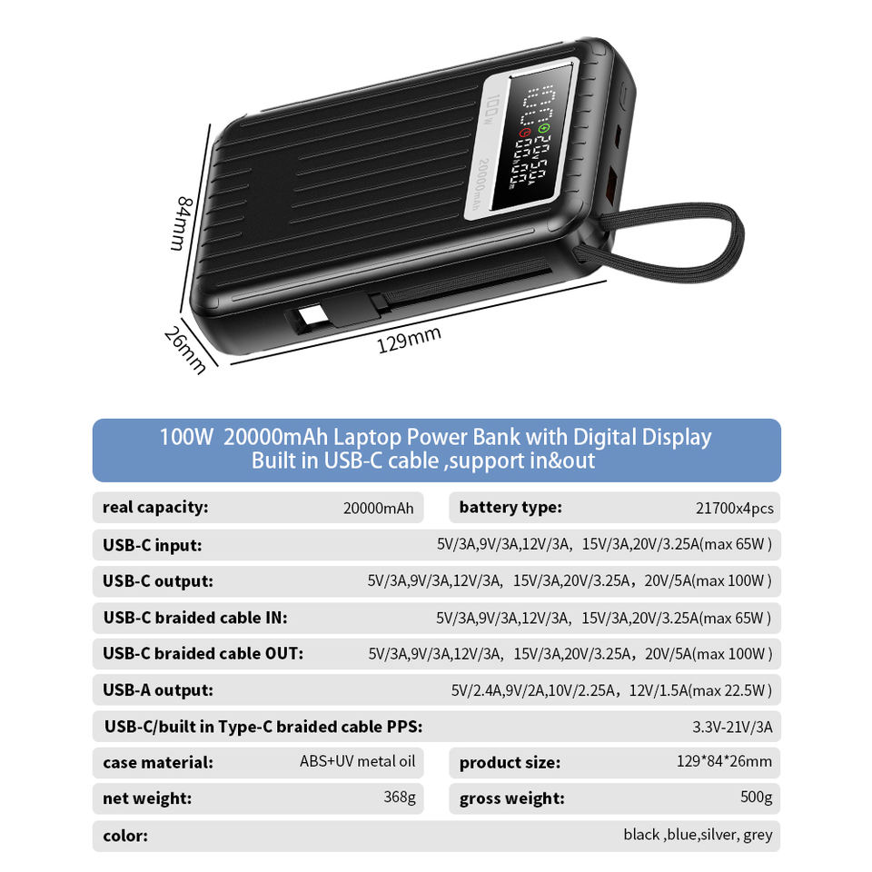 Banco de Energía Portátil de Alta Capacidad de 20000 mAh y 100 W con Carga Rápida para Laptop, Cable Tipo C Integrado y Pantalla Digital