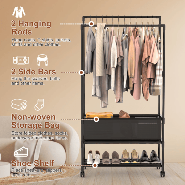 Perchero de hierro portátil de 3 niveles con doble barra colgante, ajustable en altura, resistente, para dormitorio, entrada o sobre la puerta
