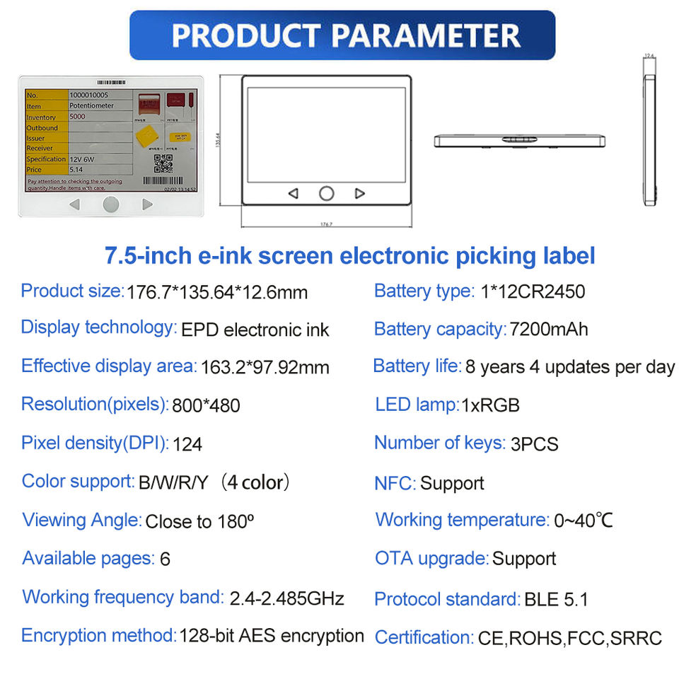 Nombre del producto:Etiqueta electrónica de picking de 4 colores con pantalla e-ink de 7.5 pulgadas.