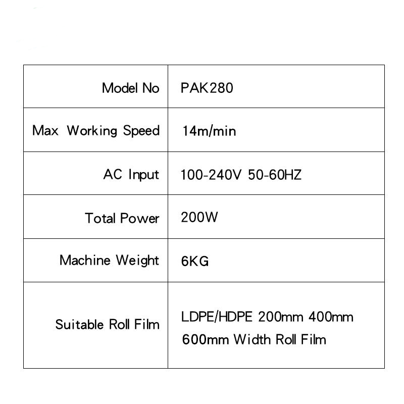 Adecuado para:Película en rollo de LDPE/HDPE de 200 mm y 400 mm de ancho