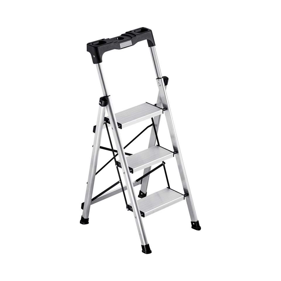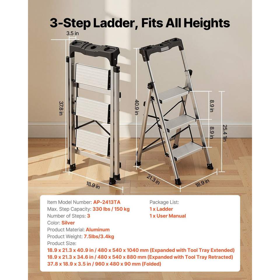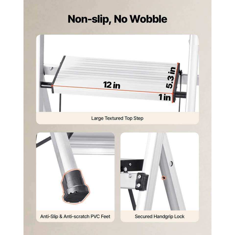 Escalera Portátil de Aluminio de 3 Peldaños con Pedal Antideslizante y Agarre Cómodo, Taburete Plegable con Capacidad para 330 Libras, Modelo D0100X3NI82