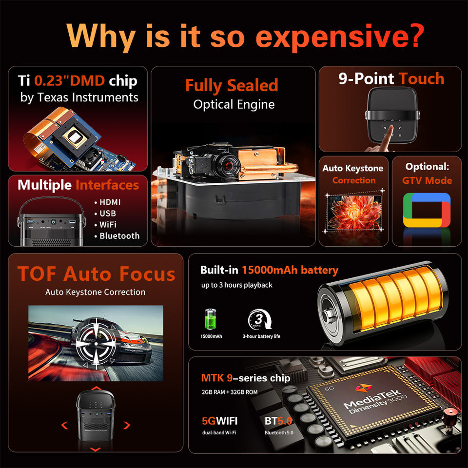Proyector Portátil Android con Batería Integrada, GTV, Netflix y YouTube, Control por Voz, Altavoces de 10x2W, Proyector Inteligente Android para Cine en Casa