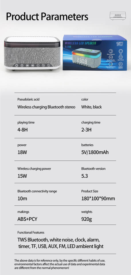 Function:Music Player/White-noise/BT/TWS /FM/TF/USB/AUX /Alarm/Clock/RGB LED